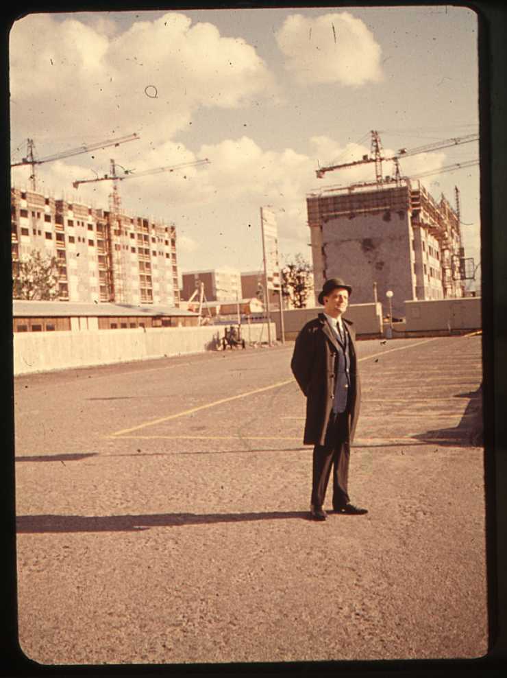 Och ett stopp i förorten. För Skärholmen sköt i höjden 1965. Kranar precis överallt att fotografera och förundras över, i ett Sverige under starkt tillväxt.