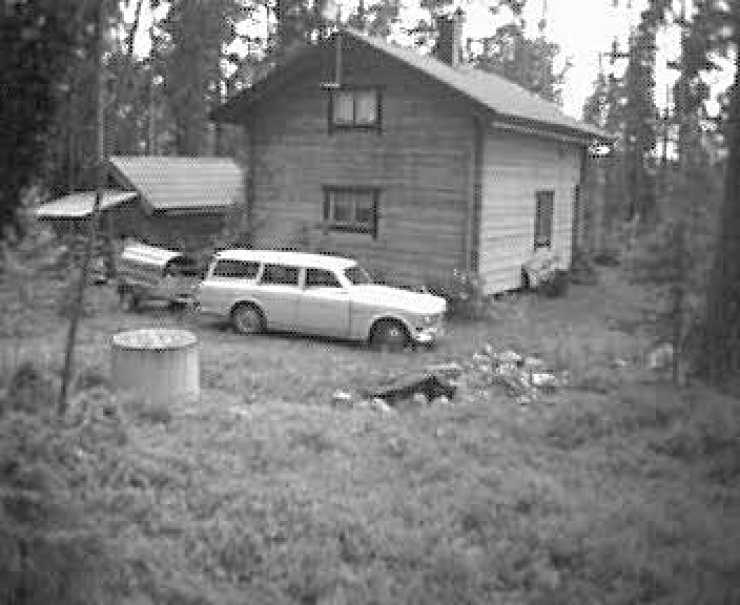 Nu står jag här bakom det knuttimrade härbret långt ut i ödemarken. Det