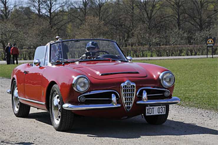 En Giulia 1600 Spider Veloce rullar in på 2009 års italienska bilmöte vid Skokloster. Största yttre skillnaden mot föregångaren Giulietta är scoopet på huven. Modellen byggdes till 1965 och ersattes 1966 av den nya Spidern som inte fick heta Giulia.