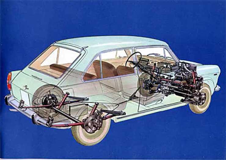 En fascinerande mix av gammalt och nytt. Helt rätt tänkt i frontänden med tvärställd maskin och framhjulsdrift. På sitt sätt också med rattväxel, vilket gav plats för fötter och välbefinnande. Men rattväxel var ändå på väg ut 1964, så som det ologiska bilmodet föreskrev. Skivbromsar runt om, klart ovanligt i mitten av 1960-talet. Men vad ser vi i bakvagnen, uh, bladfjädrar! Jättebra för bilekonomin, mindre lyckat ur körsynpunkt. Japanerna hängde kvar längs med kombinationen.