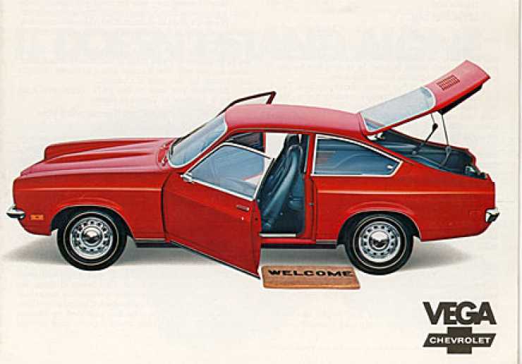 En välkomnande Vega Hatchback 1971. Den kostade i Sverige 26 950 kronor, 1700 kr mer än en Volvo 142 Grand Luxe . Svenska GM sålde bara 27 stycken Vega 1971, det enda året modellen marknadsfördes i Sverige.