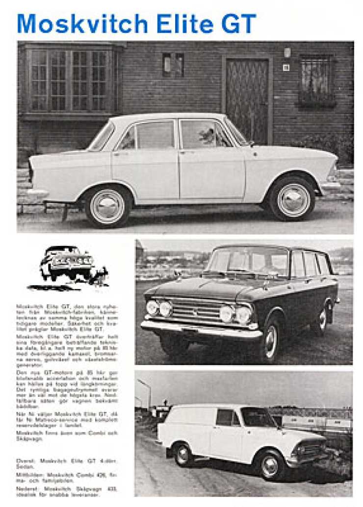 Moskvitch Elite GT hade 85 hästkrafter och gav enligt reklamen från importören Matreco "…blixtsnabb acceleration och maxfarten kan hållas på topp vid långkörningar."
