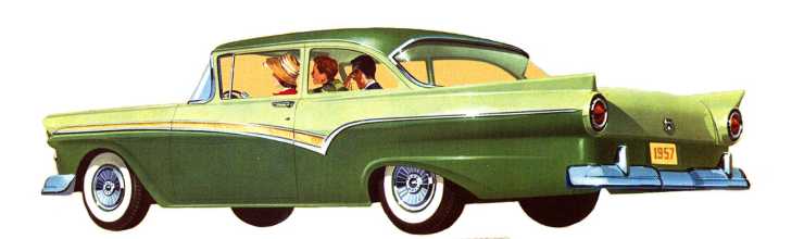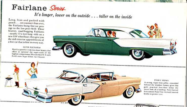 Helt ny var Ford 1957 och den kom i två storlekar med olika hjulbas, Custom och Fairlane. Den större fanns som Fairlane och Fairlane 500 med skillnad i kromprakt. Fairlane 500 var bara 2% dyrare än Fairlane och sålde över 400% bättre. Man undrar vad det var för vits med att ha två modellserier när prisskillnaden var så liten.