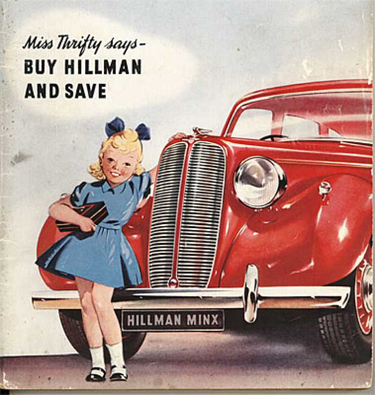 Här kommer Spara med sitt kassaskrin och uppmanar 1939 års bilkunder att köpa en Minx, som nu klätts i en bullig kaross av sent trettiotalssnitt. Karossen blev självbärande från 1940.