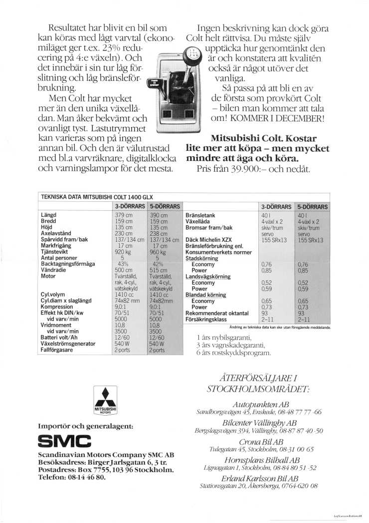 Det var en ganska snygg liten bil - med ett ess i rockärmen: TVÅ växellådor! I alla fall marknadsfördes den så. I själva verket handlade det om en vanlig fyrväxlad låda kopplad med två utväxlingslägen som skiftades med en separat spak. Detta för att bensinförbrukningen skulle bli så låg som möjligt och när den kom var Colt den allra snålaste på den svenska marknaden: 0,52 liter per mil på landsväg.