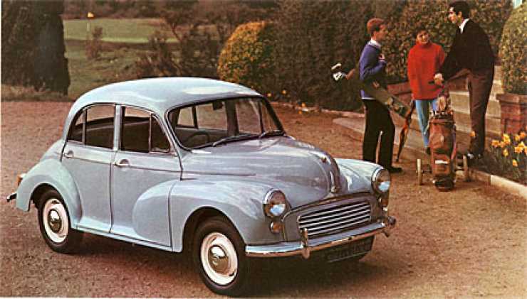 Som vi bäst minns den, Morris 1000 från sent 1950-tal. Först hade Minor en sidventilmotor med rötter i trettiotalet, sedan kom BMC A-motorn som växte från 800 via 1000 till 1100 kubik.