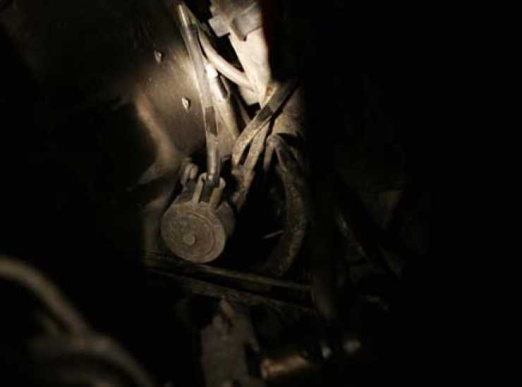 En inte helt upplysande bild. Det är fotat underifrån och jag är nästan säker på att det föreställer någon form av kopplingsdosa för vakuumslangar. En slang hade hoppat ur. Snabblagning!