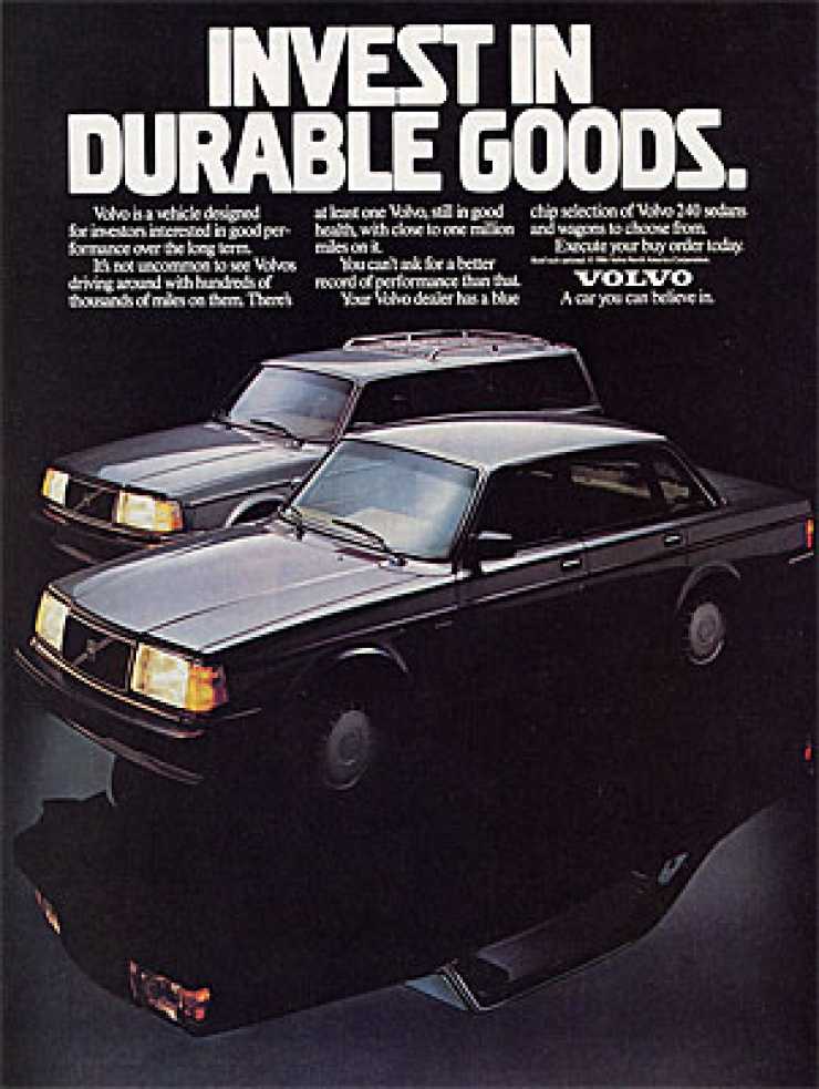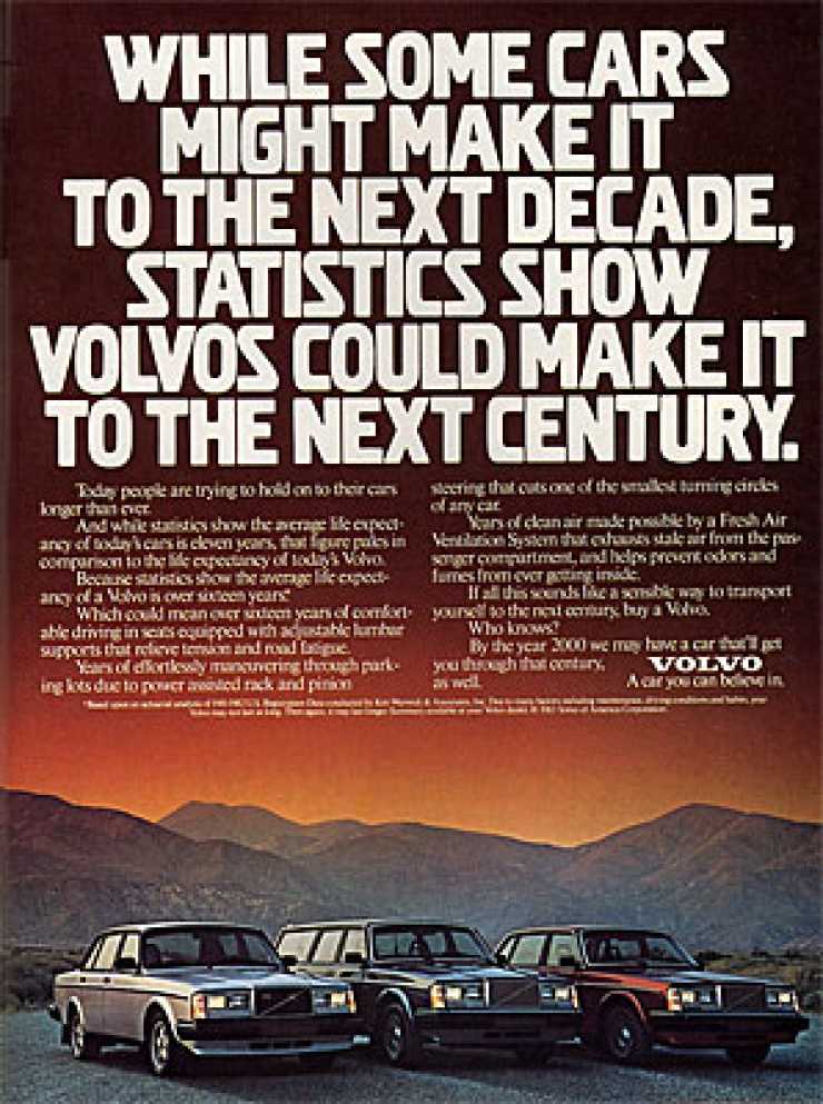 1984På 1980-talet gjorde Volvo ett nummer av bilarnas långa livslängd. Det är svårt att tänka sig att något bilmärke skulle göra en motsvarande annons idag. 16 år var den genomsnittliga livslängden för en Volvo jämfört med elva år för genomsnittsbilen. Låter som en kort livstid för en Volvo tycker jag.