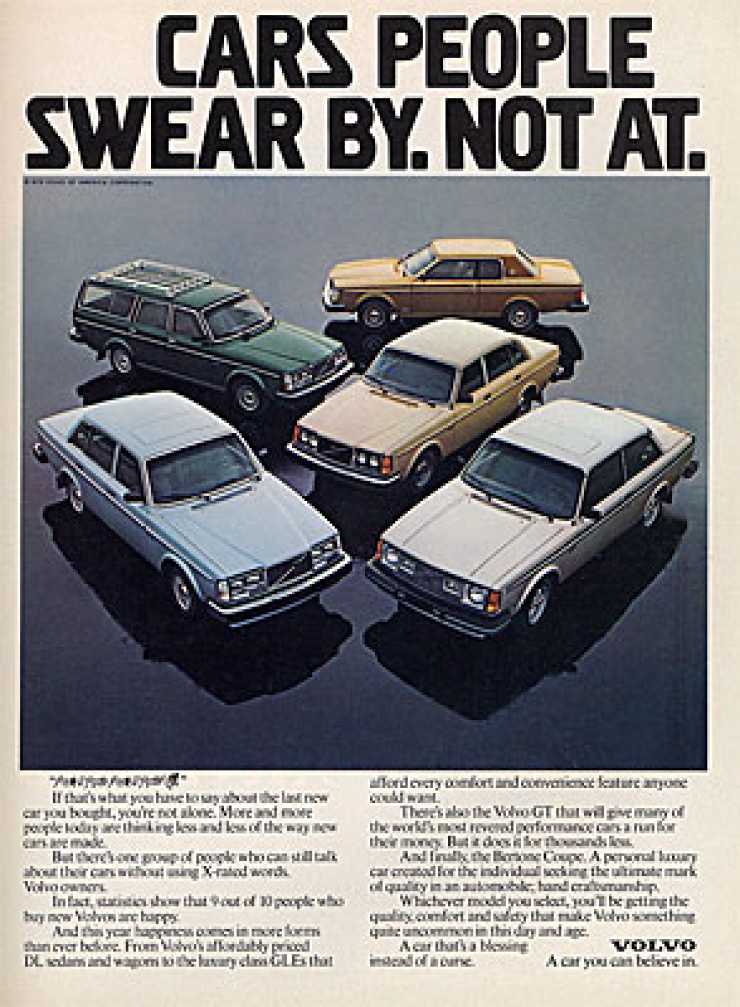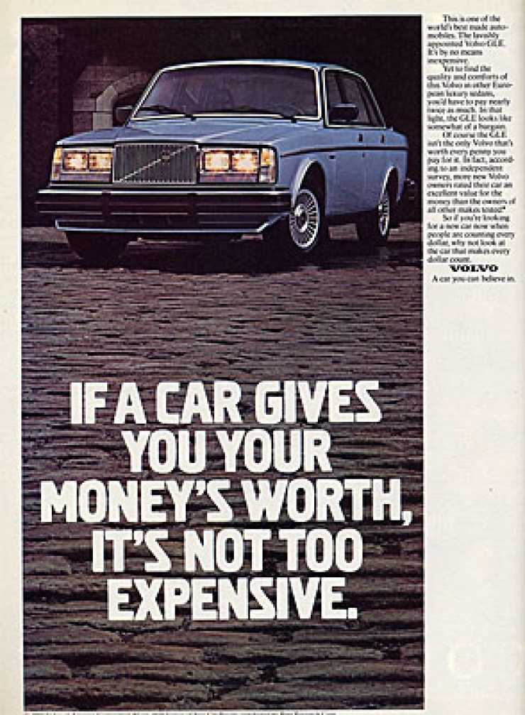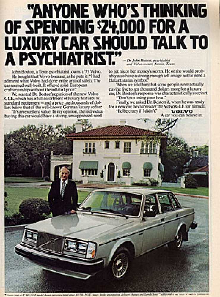 1980Saab har ibland sagts bara köpas av östkustprofessorer i USA och det är en aning smal kundkrets. Med en psykiatriker som får uttala sig om Volvo GLE (ingen sifferbeteckning här) så är den här Volvoannonsen nästan inriktad på en lika smal kundnisch. Men psykiatrikern är i alla fall från Texas och inte östkusten.