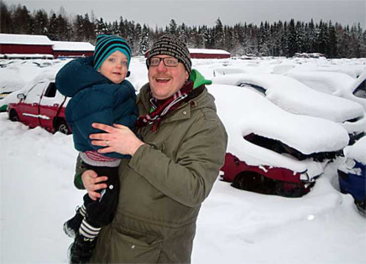 Äntligen får Axel, 2 år besöka en bilskrot för första gången! Det är Axel till vänster.