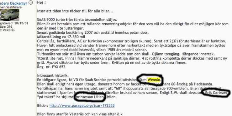 Min egna radar var kalibrerad på ett annat sätt. Sedan några månader hade jag genom Svenska Saabklubbens hemsida informerat mig om en mycket speciell Saab 9000. Den låg utannonserad till "rätt" köpare och gjorde även en kortare sejour ut på Blocket utan att denne man klev fram ur dunklet.