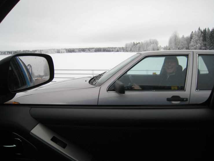 Där borta i skogsbrynet, ligger det inte en bil i diket? En vit sedan. Nått bakhjulsdrivet, svenskt.