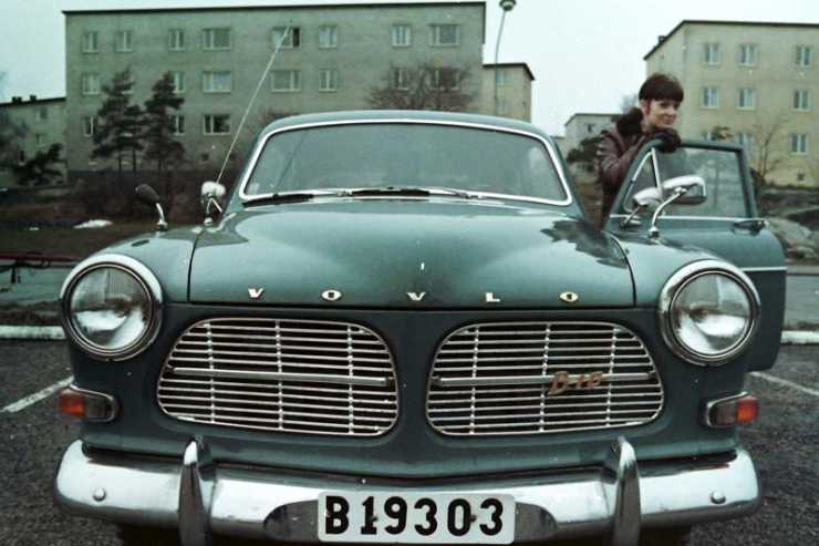 Kan detta vara ett nytt bilmärke? Nej då, trots att fronten är märkt VOVLO så är det min Volvo Amazon 62:a uppiffad med ny lack, ny grill, höger yttre backspegel utbytt mot en växelspaksknopp. Året är 1969 och intet ont anande poserar min dåvarande fru Gerthy.