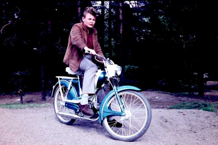 Min kompis Leffe Ernbert skulle fylla 15 bast i början av september 1960. Alla kompisar hade moppe och nu även Leffe. På grund av att det var två månader kvar till födelsedagen fick moppen bara provsittas och kanske provstartas. Monarpeden var helt ny men av en tidigare årsmodell som blivit osåld och därmed betingade ett mer fördelaktigare pris än normalt. Jag ville dokumentera Leffes nya moppe så vi tog en promenad till "Slakthusskogen" intill Ödledammarna. Bilden tog jag i den förhållandevis lugna skogsmiljön, en plats som inte längre existerar. Tele2 arena och Globen har tagit över.
