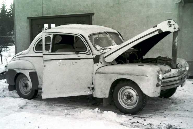 1964 kunde man för någon tusenlapp köpa en något bedagad Fordcoupé av 1946 års modell. Trimmad var den också, utrustad med Allardtoppar m.m. Platsen är Skälbyvägen 101 i Hässelby. Något köp blev det inte, en stolpe hade gjort ett stort veck i karossen bakom förardörren, därav det humana priset.