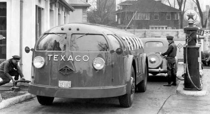 Vad som står vid pumpen här är en uppseendeväckande tankbil som kallades för "Doodlebug", gråsuggan. Den egendomliga skapelsen byggdes för Texaco och den avantgardistiska formen ritades av H.W Kizer. Doodlebug byggdes på chassi från Diamond T och året är 1935.