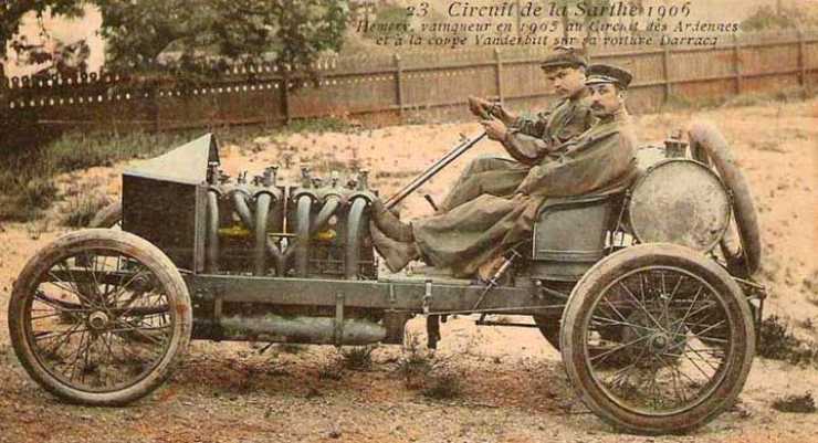 Något ovanligt, dels för att det är ett färgkort från 1906 , dels för att det är en en Darracq som kommit lite i skymundan. Föraren Victor Hemery och hans mekaniker Victor Demogeot vann den prestigefyllda Vanderbilt cup med denna maskin 1905. Den gigantiska maskinen kan misstas för en sexa men är fyrcylindrig, med pargjutna block. Volymen var imponerande 14,5 liter och den uppges haft en effekt på närmare 200 hästkrafter. Detta låter riktigt spännande när man tittar närmare i bakhjulen där bilens enda broms sitter med sina pyttesmå trummor...