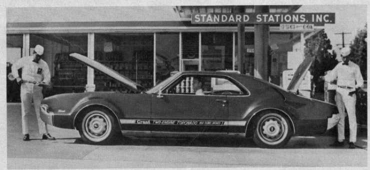 Grant McCoon hade tävlat en hel del på Bonneville salt flats och kom 1966 upp med en idé för att få den nya Oldsmobile Toronado att gå lite fortare. Man satte en extra motor bak, och det gjorde bilen även fyrhjulsdriven. Tanken var att bygga en liten serie för folk som ville ha en extra 425" motor istället för bagageutrymme och bra mycket mer krut i sin Toronado. Den skall ha gort 0-160km/h på drygt elva sekunder! Det totala effektuttaget var 770 hästar på båda motorerna, men man kunde även köra dom var för sig. Dubbla gaspedaler och dubbla tändningsnycklar skulle tekniskt sett göra detta möjligt. Hur det fungerade i praktiken var nog en annan femma, för det gjordes inte någon mer fyrhjulsdriven dubbelmotoriserad Toronado.