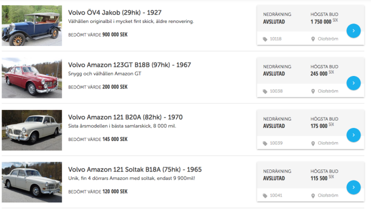 En mycket fin 123 GT gick för 325 000 kronor och en replika av rallyföraren Carl-Magnus Skoghs bil klubbades för 305 000 kr. Även enklare Amazoner inbringade historiskt sett stora summor, en standardmodell från 1967 kom upp i 105 000 kr.