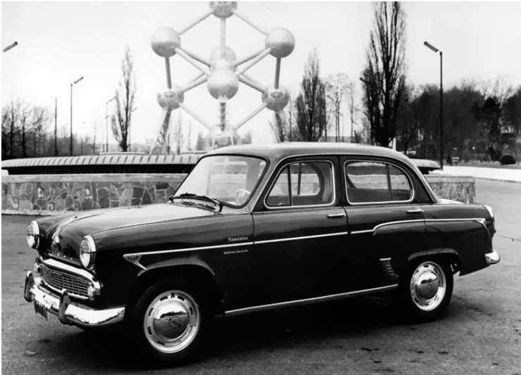 Framför atomiumet i Bryssel står en Moskvitch som inte hette Moskvitch.