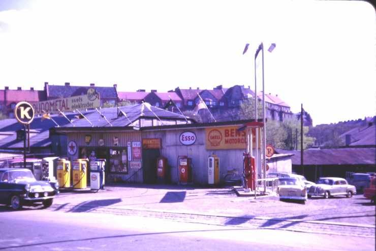 Här skymtar Essos pump i trängseln med några andra, från bland annat Shell och Koppartrans, det egna svenska bensinmärket som hade sin storhetstid på 1950- och 1960 talet. Koppartrans blev sedermera uppköpt av Shell. I hörnet står ett par pumpar med Nynäs och Texacos loggor, fast frågan är om de är i bruk. Är vi egentligen på en Essomack, eller bara ett slags slutförvaringsställe? På taket tronar en skylt om Soudometals svetselektroder, det är ingenting som man frågar om efter på macken idag men till skillnad från bensinbolagen på skyltarna har firman Soudometal överlevt.