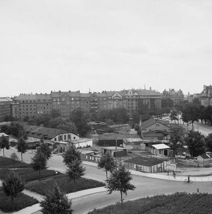 Området ser ut att vara rejält på dekis, och det var det också. Det är svårt att tro att vi är på Valhallavägen, där gallerian Fältöversten ligger idag. Finns någon läsare därute som minns kvarteret Fältöversten före gallerian?
