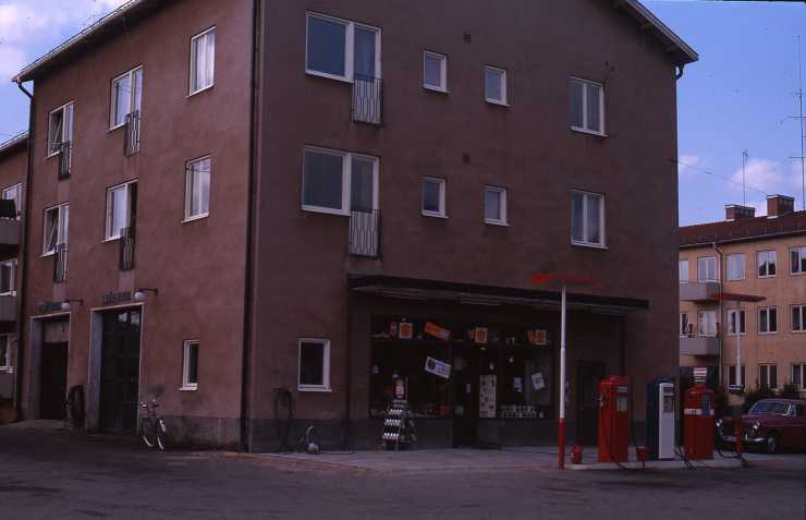 På den tredje bilden är vi åter inne i stan, vid Bantorget närmare bestämt. I bottenplanet på ett bostadshus ligger Essomacken, komplett med smörj- och tvätthallar. Får vi gissa att innehavaren bor på övervåningen?