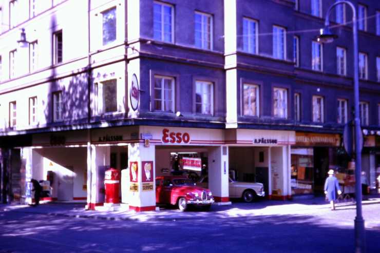 Vi vill gärna tro att detta är macken vid Östermalmstorg. Hörnmacken. Det fanns ett antal i huvudstaden – sedan länge bortrationaliserade av hygienskäl. Här har just en Saab 96 klarat av blandningsproceduren och repat liv i 850-kubikaren och det ska ta åtminstone en 20 minuter innan den treprocentighaltiga doftmarkeringen till sin helhet vädrats ut ordentligt i kokvrån ovanpå. Där familjen steker fläsk så ofta det bara går för att skyla över.