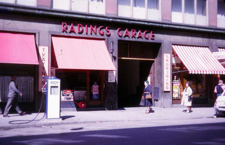 En pump på trottoaren, ett litet kontor och ett garage i källarplanet. En mack mitt i stan, på Rådmansgatan 54 i Stockholm. Rådings Garage står det på fasaden. Det måste vara tidigt 1960-tal. Det är sommar eller sen vår. Vårkappor och snitsiga kostymer.