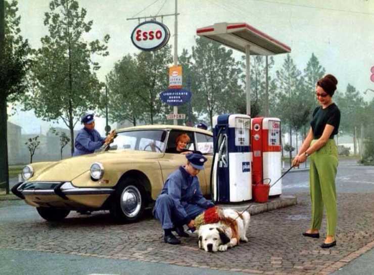 Tankning, kolla olja och vatten och en puts av rutan var självklarheter på macken förr. Fast man kanske inte alltid dammade av hunden också, men i allafall gjorde man det vid det här fototillfället, i Frankrike någon gång tidigt 1960-tal.