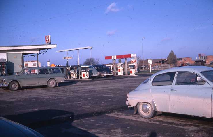 Längst till höger på macken rakt ovanför bakrutan på Saaben står en tingest som sedan många år är utraderad från bensinstationerna. Det är ingenting annat än en Selfometer.