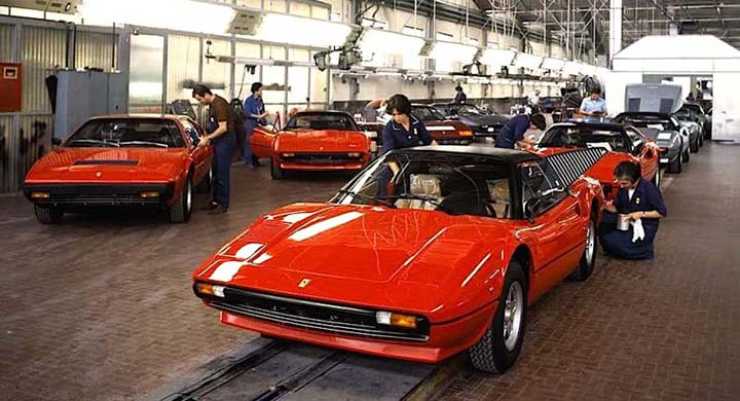 Här ser vi ett gäng som har just denna trevliga uppgiften. Dom lägger sista touchen på splitter nya Ferraris som skall vidare ut till kunder. På dessa gnistrande röda nylackade sportbilar får det inte finnas några kosmetiska skavanker. I främre raden Ferrari 308, i bakgrunden syns 308GT och 365GT4BB alternativt BB512, superbilen med mittmonterad boxertolva.