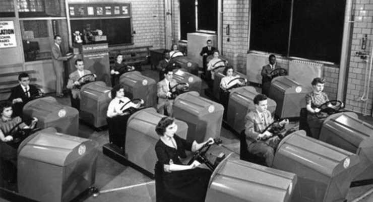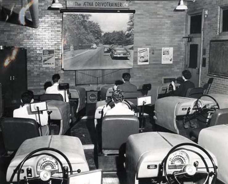 Platsen är Brooklyn High School och året är 1953. Dessa apparater kallas Aetna Drivotrainers och var en slags primitv körsimlulator, sådana här fanns i amerikanska bilskolor åtminstone fram till 80-talet, eller i grundskolan med för den delen, då man försynt nog hade allmän körutbildning på schemat i High school på flera håll.