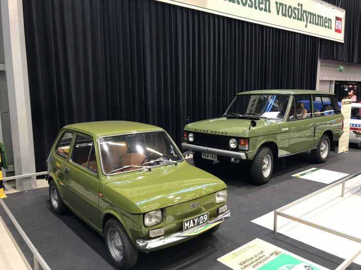 Fiat 126 och Range Rover i samma kulör visar bredden både på utställningen och 1970-talet. (Foto Filip Stén)