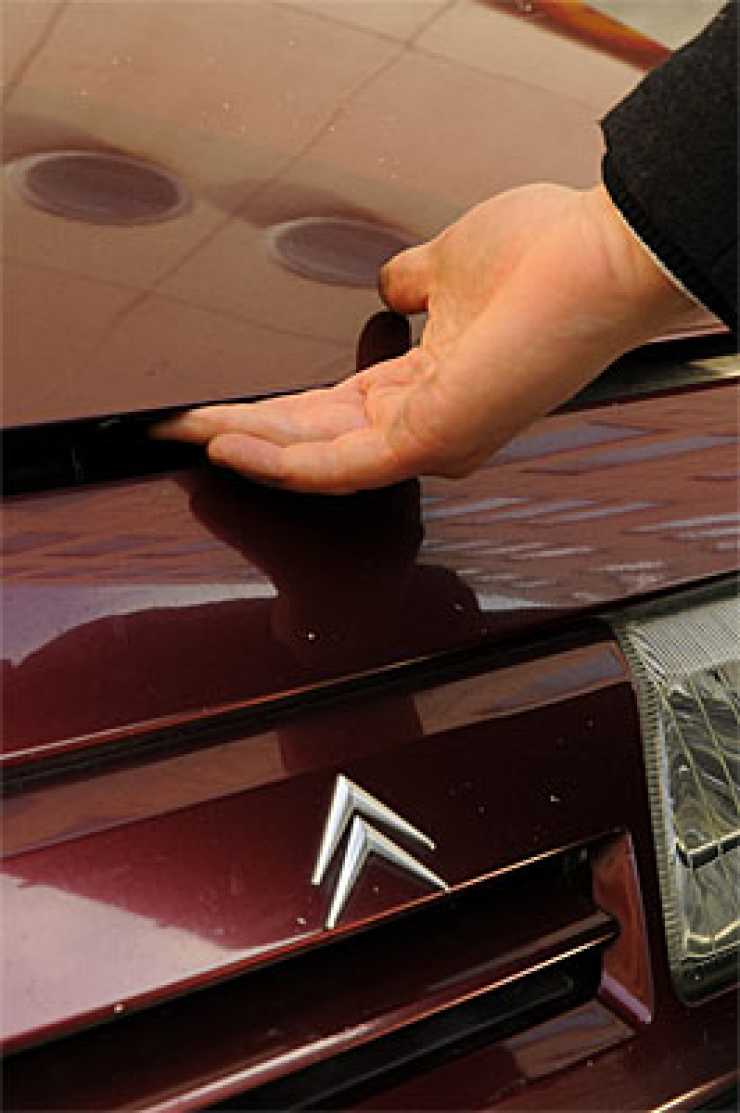 - På alla andra bilar måste man alltid treva med fingrarna efter huvspärren, här är det perfekt utmärkt med två pilar, säger Christian och pekar på det assymetriskt placerade Citroënmärket i nosen.