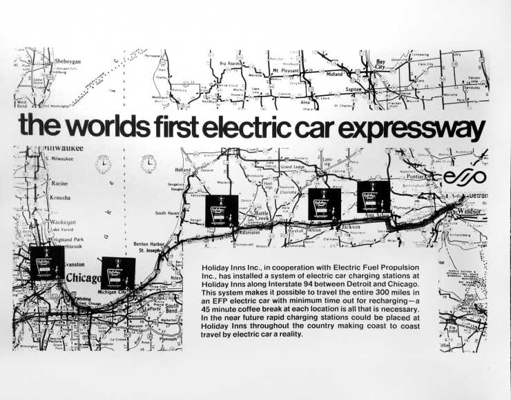 Sent 1967 öppnade världens första Electric Car Expressway mellan Detroit och Chicago. Snabbladdningsstationer hade placerats ut på fem Holiday Inn-anläggningar längs den knappt 50 mil långa sträckan.