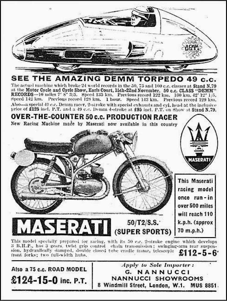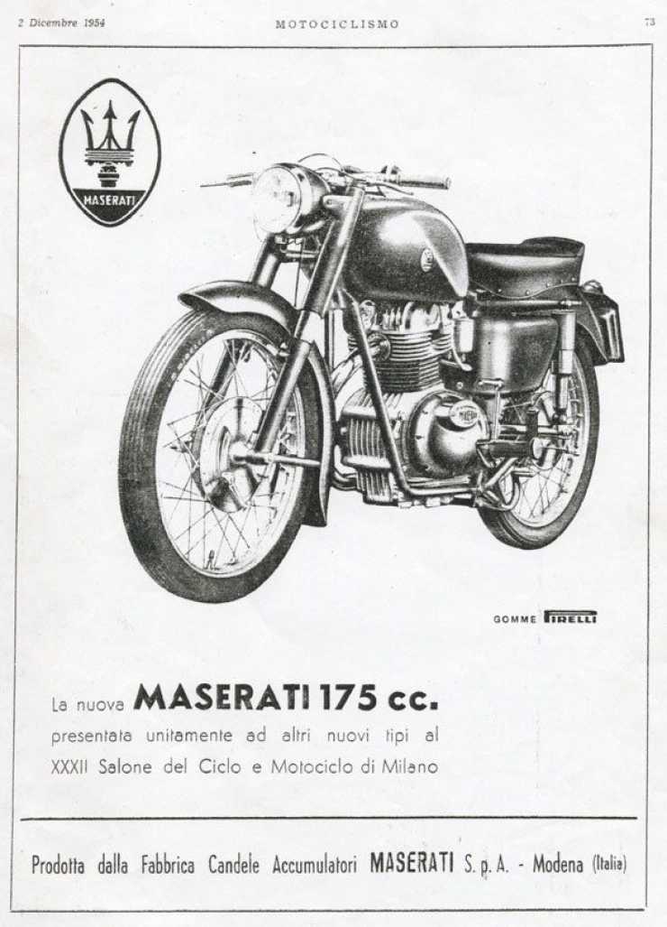 Det var strängt taget inte Maseratis egna motorcyklar heller då man köpte upp Italmoto i Bologna 1953. De i sin tur hade baserat sina motorcyklar på DKW:s modeller. Man hade från början tre modeller - två 125cc tvåtaktare och en större 160cc fyrtaktare.