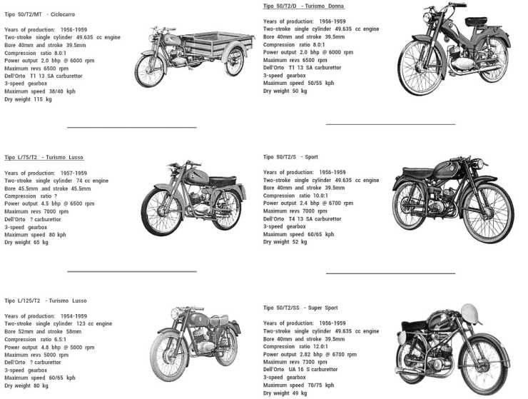 Senare kompletterades det med 175- respektive 250-maskiner, och 1956 tillkom en liten 50-kubikare i sortimentet. En racermoped som hette T2, men kallades Rospo - vilket betyder paddan. Den utvecklades till en mer civiliserad moped, samt en trehjulig 'ciclocarro' - alltså en lastmoped.