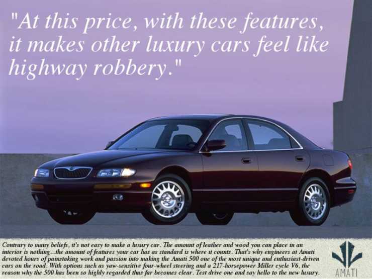 Som en slags halvmesyr kom ändå en Amati ut - Amati 500. Den hade varit tänkt som en mellanmodell i Amatiprogrammet, och hade också haussats upp till lite mer än vad den var. En helt vanlig Mazda Millenia, i Japan även kallad Eunos 800.