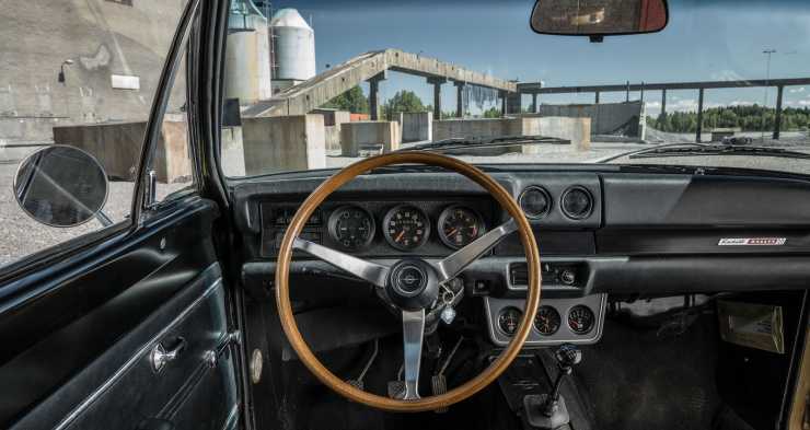Sol steker plast och med den biffiga kardantunneln som täcker efterspelet till den stora 90-hästars 1900-motorn är det minst sagt trångt men å andra sidan kompenserat av en vibrerande känsla av sprittande bus. Med svart innertak, extraljus, bredare fälgar, ränder och utsikt över mattsvarta fält på huven var detta bland det tuffaste man kunde köpa sig i skarven 60- och 70-tal. Tio år senare kom Audi Quattro, men i jämförelse är den här som hämtad från en annan galax. Idag kör vi old school – på sladd!