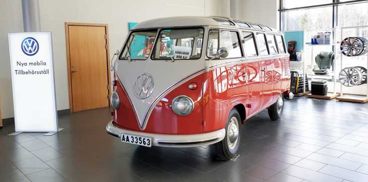 I Volkswagen Group Sveriges foajé i Södertälje möter en fantastisk VW Lyxbuss från 1960 besökarna.