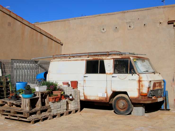 På en bakgård i Bolnuevo i södra Spanien står en märklig Mercedesbuss, som egentligen är en DKW.