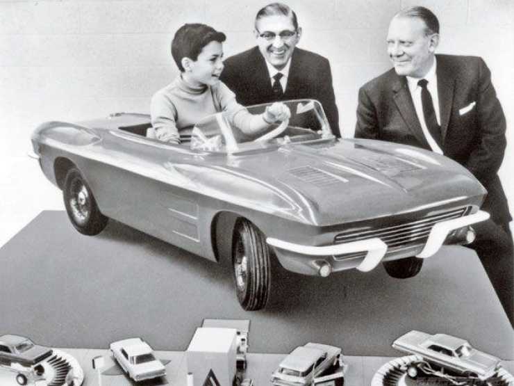 Semon "Bunkie" Knudsen hade en lång karriär inom GM från 1939, och tog över rodret för Chevrolet 1961. Här är han tillsammans med Lawrence H Averill, som var mer verksam inom området juridik och ekonomi, i vilka han publicerat många böcker. Hans huvudsakliga fokus var bilindustrin, och instiftade även en fond för ungdomar som vill satsa på en karriär i det fältet. Kanske killen på bilden senare kom att få ett stipendium från den fonden? Hur som helst verkar han vara rätt lycklig i att få provsitta en Corvette Stingray trampbil i studion tillsammans med dessa två prominenta herrar 1963.