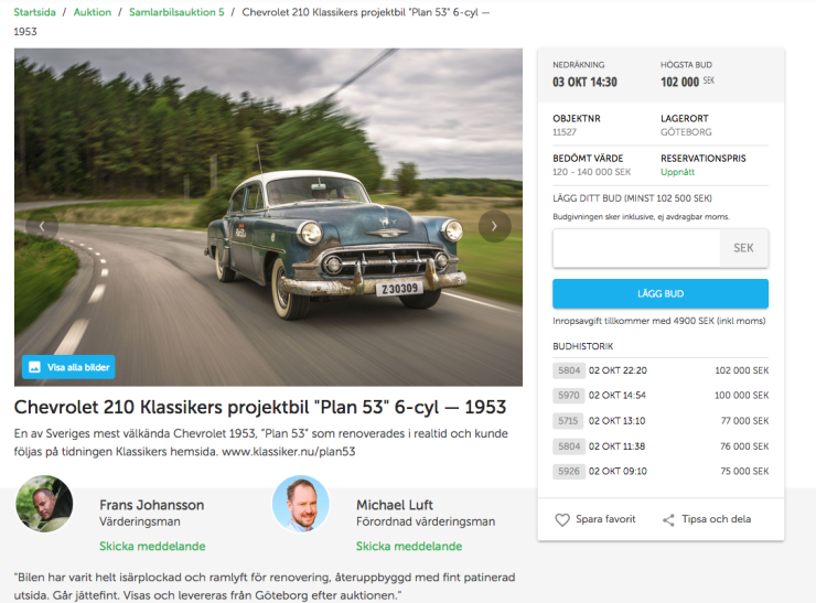 I skrivande stund ligger budet på 102 000 kronor och eftersom reservationspriset är uppnått finns en chans att budgivaren får bilen för den summan. Av erfarenhet vet vi dock att det är på slutet som det hettar till på riktigt.