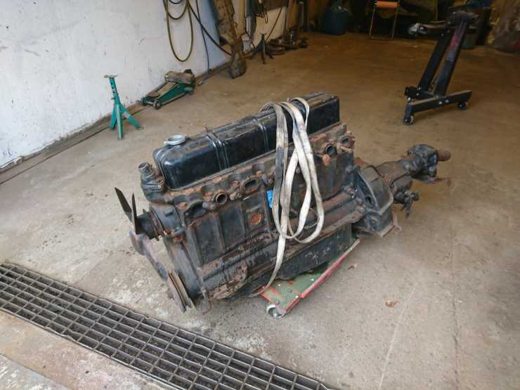 Motorn stod i en lada under en presenning med växellådan monterad. Insug, generator och en del småprylar låg inne i bilen och det gick helt enkelt inte komma åt att prova om maskin gick runt.