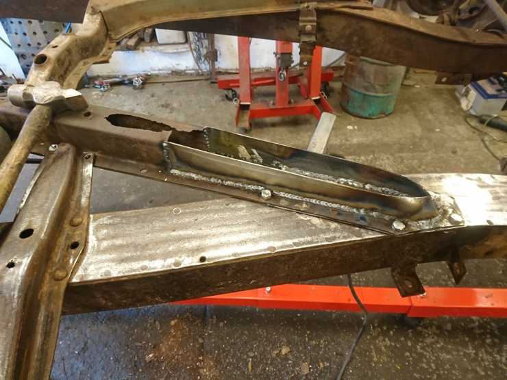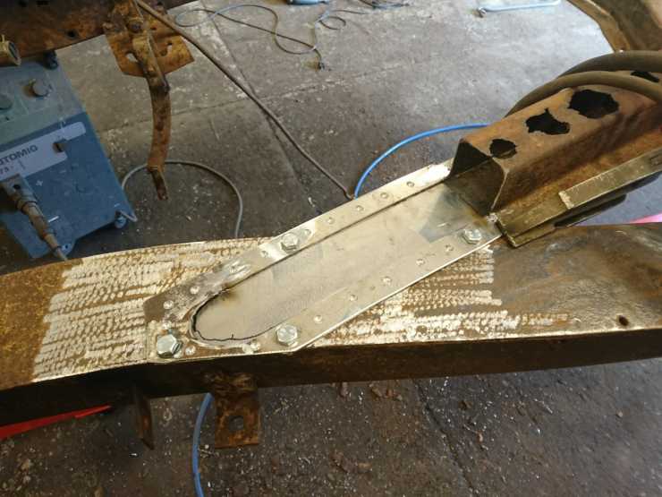 Några plattjärn bultade i stötfångarens hål som jag svetsar mot kaross-snurrans fästarmar