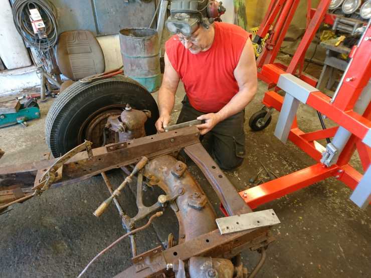 Rostjobbet på ramen känns annars väldigt stimulerande. Framför allt då man har en bra arbetsställning. Tänk bara att ligga under bilen och försöka göra detta. Det hade bara inte gått och då inser man även att ramlyftet var alldeles nödvändigt.