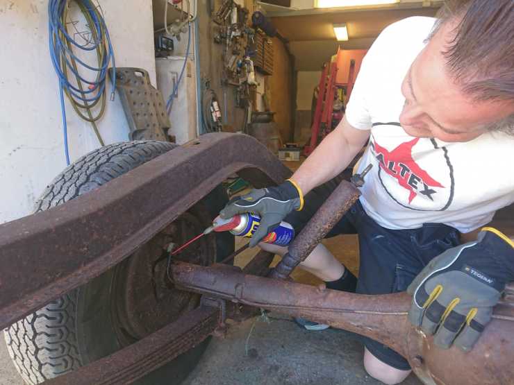 Kåre går loss och dränker in alla skruvar och fästförband med WD-40