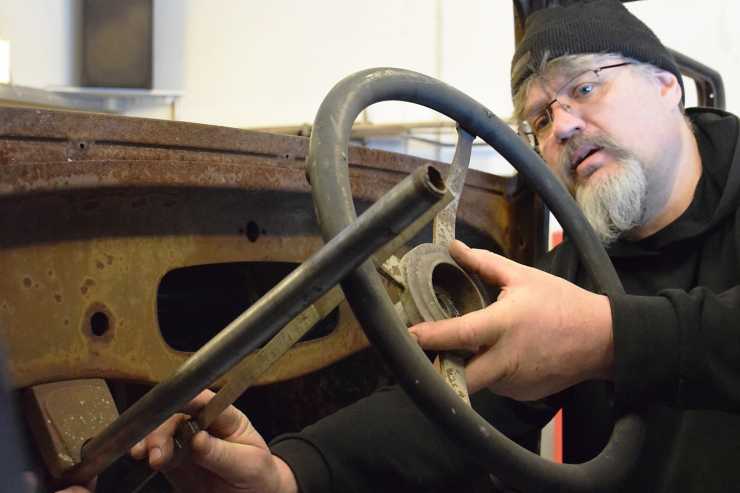 Det enda mixtret är att det i centrum på ratten sitter en spak som man justerar tändningen med. Den spaken med tillhörande axel stöder på muttern som håller själva ratten. Det måste med andra ord bli rätt höjd på kona och tillhörande gänga.