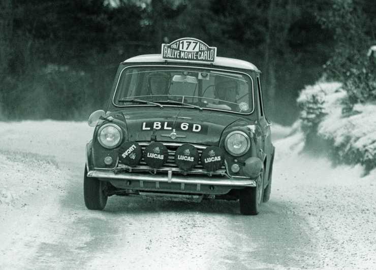 Rauno Aaltonen och Henry Liddon på väg mot seger i Monte Carlo-rallyt 1967.